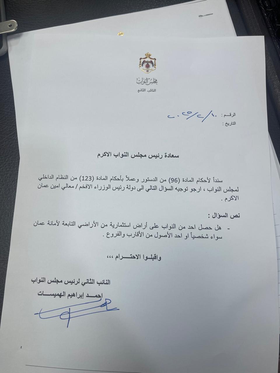 الهميسات يسأل رئيس الوزراء وأمين عمان عن حصول أحد النواب على أرض استثمارية تابعة للأمانة