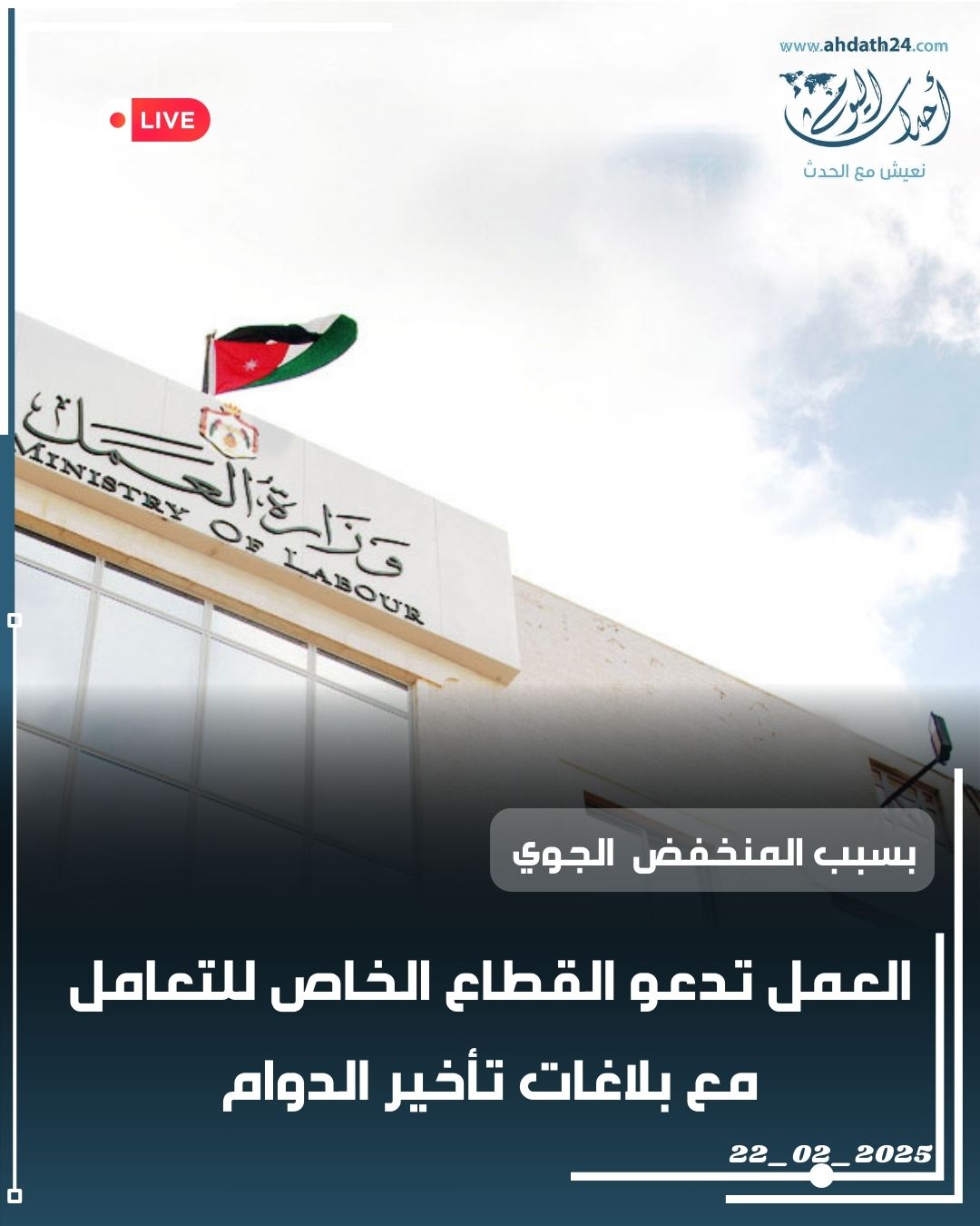 أحداث اليوم - دعت وزارة العمل اليوم السبت مؤسسات القطاع الخاص إلى الالتزام بالتوجيهات الصادرة من رئيس الوزراء بشأن تأخير بداية الدوام خلال الأيام الثلاثة المقبلة (الأحد، الاثنين، الثلاثاء 23، 24، 25 فبراير)، وذلك حفاظاً على صحة وسلامة العاملين وحمايتهم من تأثيرات الأحوال الجوية السائدة. وأشارت الوزارة إلى ضرورة مراعاة طبيعة عمل كل مؤسسة والظروف المناخية في المنطقة التي تعمل فيها والمؤثرات على مكان سكن العامل.