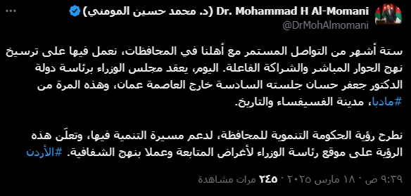 وأشار المومني في تغريدة عبر منصة "إكس" إلى أن الحكومة ستطرح خلال الجلسة رؤيتها التنموية للمحافظة، وذلك بهدف دعم مسيرة التنمية فيها وتعزيز دورها في مختلف المجالات.
