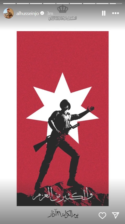 أحداث اليوم - نشر سمو ولي العهد، الأمير الحسين بن عبدالله الثاني، عبر خاصية الستوري في حسابه بالأنستغرام منشورا يستذكر فيه معركة الكرامة التي تصادف اليوم.