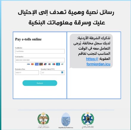 أحداث اليوم - حذر الناطق الإعلامي باسم مديرية الأمن العام، المواطنين من رابط احتيالي يرد على هواتف المواطنين ومروّس باسم الشرطة الأردنية ويدعوهم للدخول للحصول على سجّل للمخالفات تجنّباً لتفاقمها.