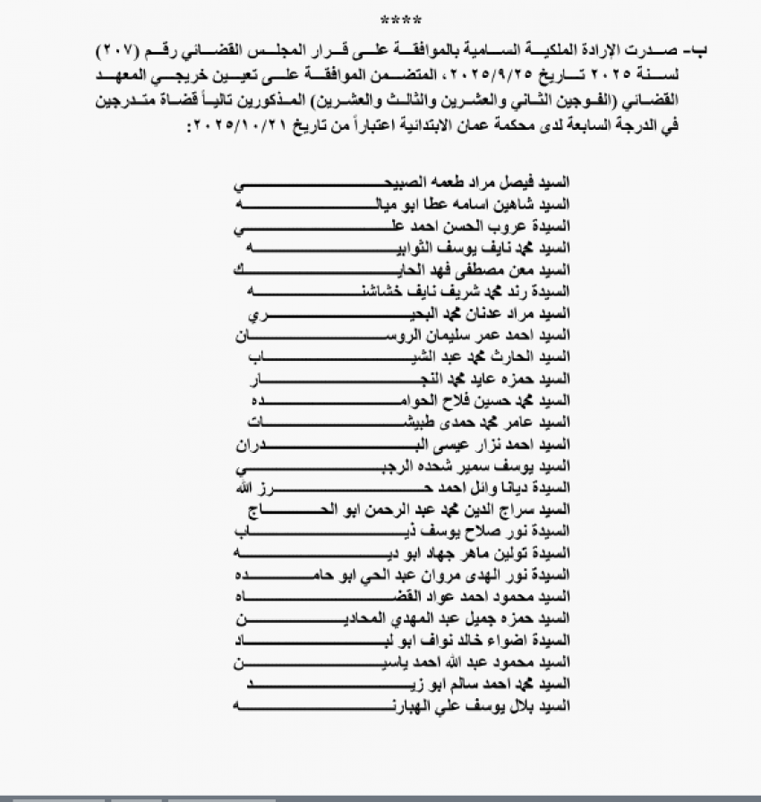 أحداث اليوم - صدرت في الجريدة الرسمية اليوم الخميس، إرادة ملكية سامية بالموافقة على تعيين قضاة من خريجي المعهد القضائي الفوجين الثاني والعشرين والثالث العشرين، قضاة متدرجين في الدرجة السابعة لدى محكمة عمان الابتدائية اعتباراً من تاريخ 21/10/2025.
