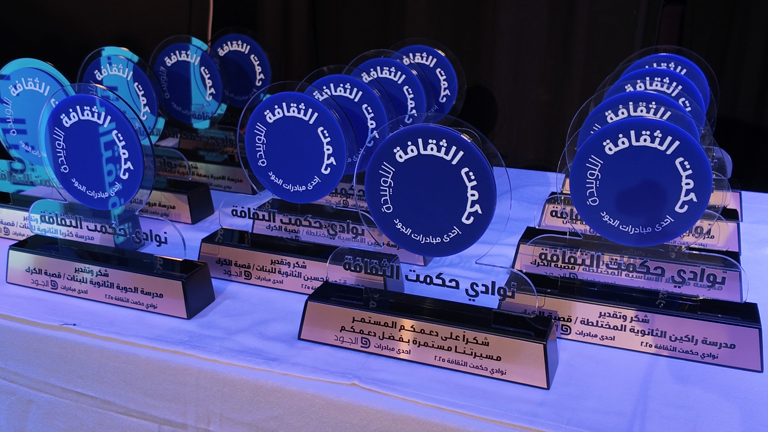 تحت رعاية معالي العين هيفاء النجار، وبحضور عطوفة مدير إدارة النشاطات الأستاذ عبد الحكيم الشوابكة، والأستاذة رانيا قسطنطين – المدير العام لمؤسسة الجود للرعاية العلمية، أقيم حفل تكريم المدارس الحكومية الفائزة بنوادي حكمت الثقافة 2025، التي أطلقتها مؤسسة الجود للرعاية العلمية يوم الأربعاء 10 كانون الأول 2025 على مسرح أسامة المشيني في جبل اللويبدة.