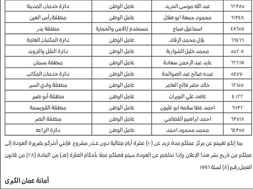 أحداث اليوم - وجّهت أمانة عمّان الكبرى، اليوم الأحد، إنذارًا لعدد من العمال والموظفين المتغيبين عن أعمالهم.