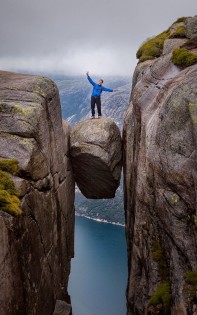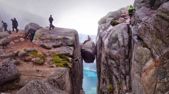 نشرت صحيفة”ديلي ميل”البريطانية صوراً لمجموعة من السياح قرروا تسلق أخر صخرة في العالم، وهي تقع بين شقي جبل شاهق الإرتفاع، حيث يصل إلى ارتفاع 1110 متر فوق سطح البحر.وتعرف الصخرة باسم “كيغيراج بولتن”، و تقع على حافة جبل كجيراج في النرويج، ويذهب إليها السائحون الذين يبحثون عن المتعة والمخاطرة بحياتهم من أجل قضاء عطلة قد تنتهي بكارثة.وقام واحد من المجموعة بالتقاط بعض الصور مع خمسة من أصدقائه وعلق قائلاً: “خلال زيارتنا كانت هناك الكثير من الأمطار، وكانت الصخرة زلقة، ولكننا أردنا تجربة هذا المكان المثير للدهشة، فمن الصعب وصف الشعور عندما تقف فوق الصخرة”.
