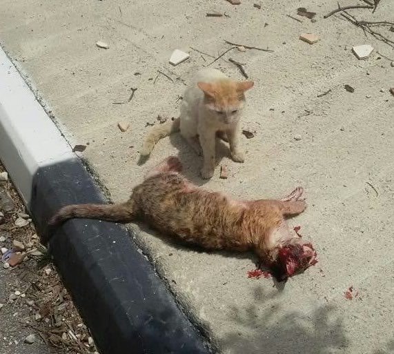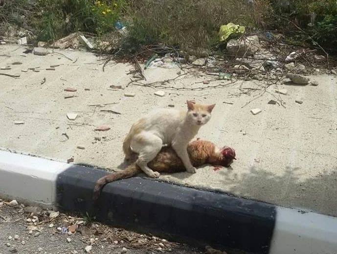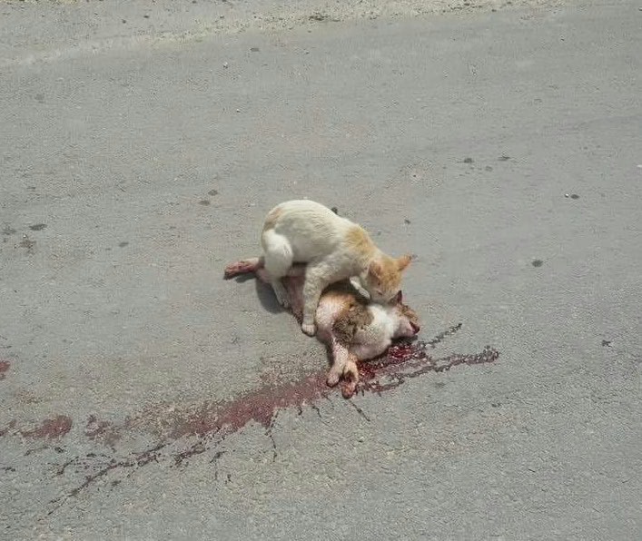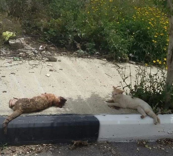 تناقلت صفحات التواصل الاجتماعي اليوم صورا لقطة تنقل أخرى تعرضت للدهس إلى جانب الطريق وتجلس بجوارها في مدينة طولكرم.