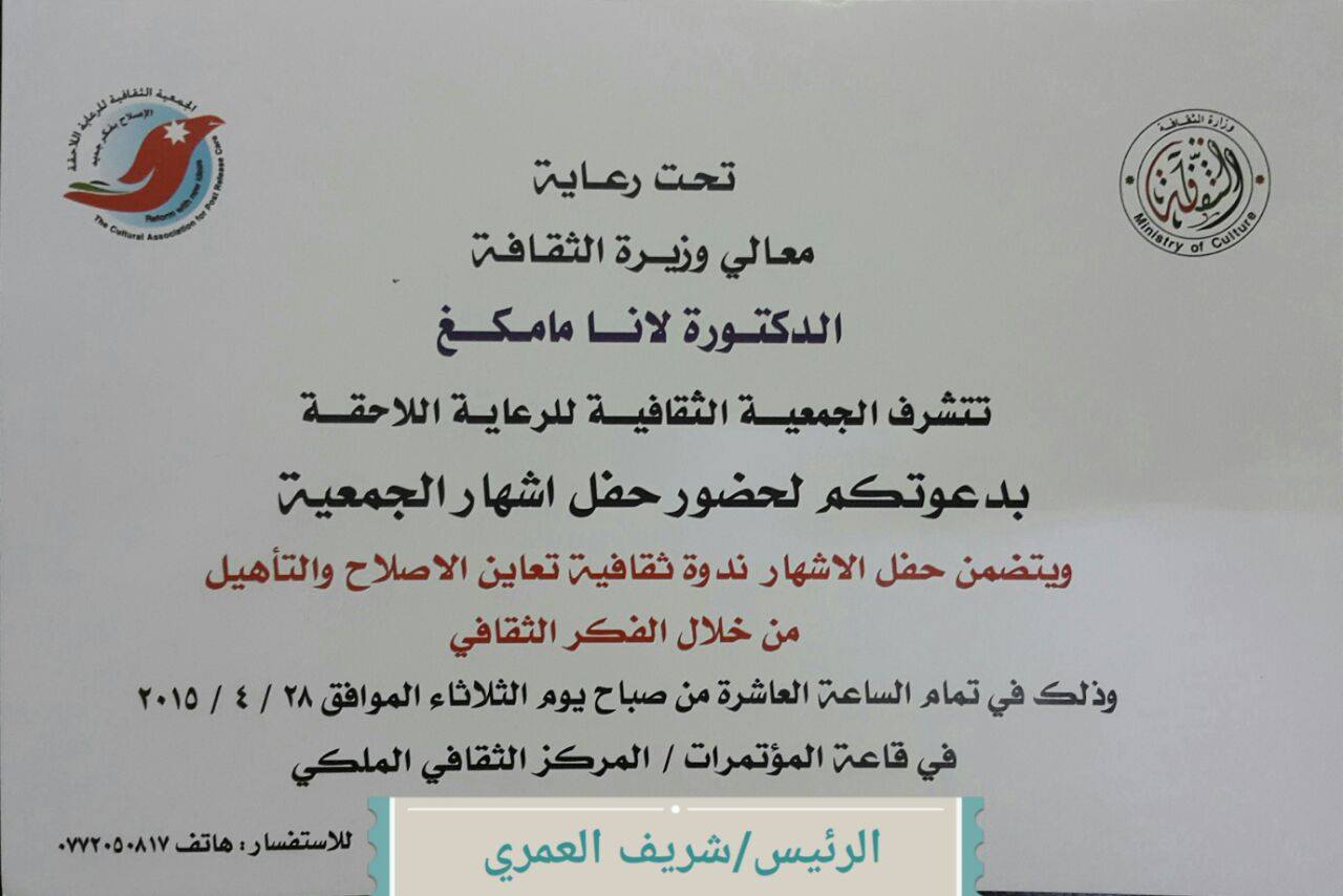 ترعى وزيرة الثقافة لانا مامكغ حفل اشهار الجمعية الثقافية للرعاية اللاحقة وذلك غداً الثلاثاء في قاعة المؤتمرات بالمركز الثقافي الملكي في عمان .