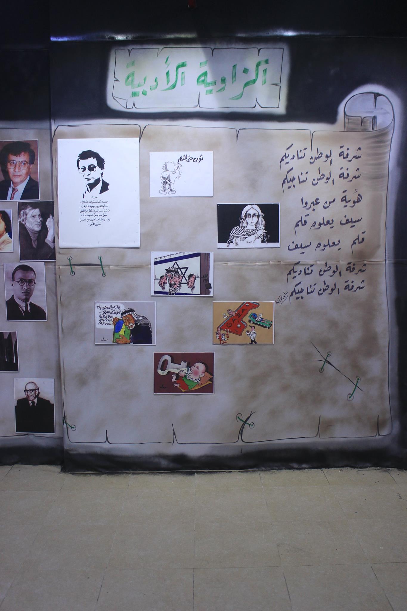 يذكر أن المعرض تكون من عدة غرف و هي( المدن، التراث ، غزة ، المقاومة ،السجن ،المخيمات) و تضمن المعرض زوايا ثقافية و تراثية عرضت العديد من (الأعمال الأدبية، الصور، اللوحات الفنية، الكتب) التي بامكانها أن تسهم برفع ثقافة الطلاب اتجاه القضية و مراحل تشكلها .