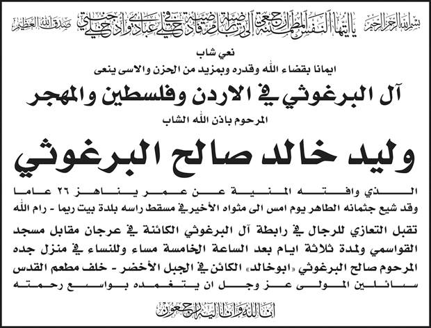 انتقل الى رحمة الله تعالى الشاب اليافع وليد خالد البرغوثي بعد مصارعته مع مرض السرطان لعدة اشهر عن عمر يناهز 26 عاما.