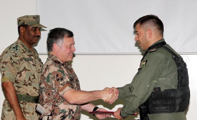 وكان جلالة القائد الأعلى، قد رعى في مدرسة الأمير هاشم بن الحسين للعمليات الخاصة أمس حفل تخريج دورة الطيران التعبوي الخاصة بلواء الأمير هاشم بن عبدالله الثاني طيران العمليات الخاصة/5 المتخصصة بالعمليات الليلية لدعم جميع صنوف ووحدات القوات المسلحة، ودورة الطيران التعبوي الخاصة بطياري ومآمير النقل الجوي في سلاح الجو الملكي. وحضر التمرين وتخريج الدورات عدد من كبار ضباط القوات المسلحة.-(بترا)