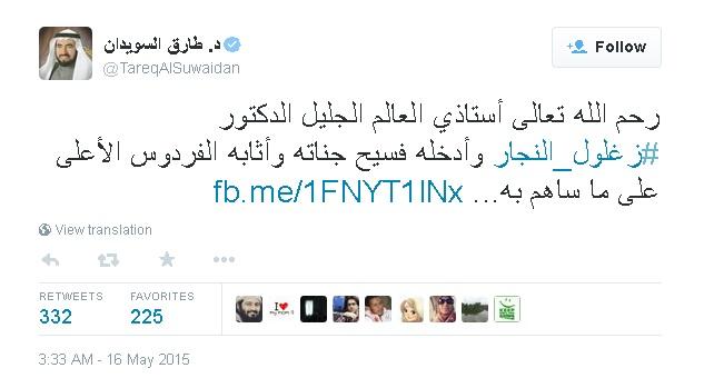 وكان الداعية سويدان قال في تغريدة له على "تويتر".."رحم الله تعالى أستاذي العالم الجليل الدكتور زغلول النجار وأدخله فسيح جناته وأثابه الفردوس الأعلى على ما ساهم به".
