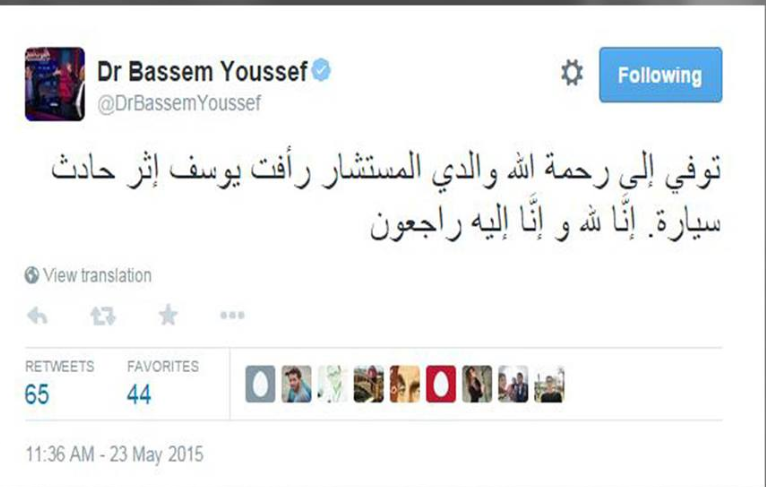 أعلن الإعلامي المصري الساخر باسم يوسف وفاة والده المستشار رأفت يوسف، إثر حادث سير، عبر حسابه الخاص على تويتر.