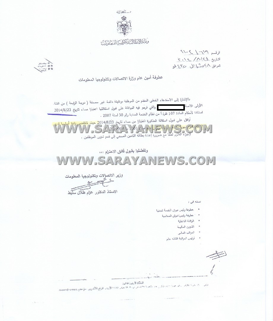وبالتفاصيل، وبحسب الوثائق، فإن مديرة مكتب الوزير كانت تعمل منذ العام 2005 بوظيفة دائمة على الفئة الثالثة ومن ثم ترفيعها الى الفئة الثانية وبقيت بنفس الوظيفة حتى العام 2014 ، وبتاريخ 2014/8/23 تقدمت هذه الموظفة بإستقالتها، حيث كانت في تلك الفترة تتقاضى راتباً أساسياً مقداره (207) دنانير يضاف اليه باقي العلاوات، وبتاريخ 2014/8/5 بعث وزير الاتصالات في تلك الفترة بكتاب الى رئيس الوزراء عبدالله النسور يطلب فيه الموافقة على تنسيبه لتعيين هذه الموظفة بعقد، بمعنى ان الوزير أرسل الكتاب لرئيس الوزراء قبل ان تتقدم الموظفة بإستقالتها من وظيفتها السابقة.