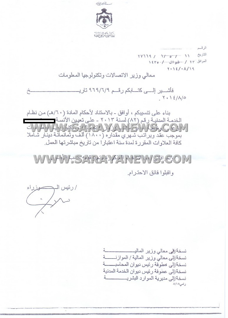 وكان رئيس الوزراء قد وافق على الكتاب رقم (969/6/9) بتاريخ 2014/8/5 على تعيين الموظفة، وقرر منحها راتباً شهرياً مقداره (1800) دينارا شاملا كافة العلاوات المقررة، وطلب النسور بحسب الوثيقة من الوزير تزويده بعقد استخدام المذكورة ليتم توقيعه حسب الاصول ،وذلك بموجب كتاب الرئيس المؤرخ في 2014/8/19 أي قبل موعد استقالة الموظفة المذكورة، مما يعد ذلك استغفالاً لرئاسة الوزراء وعدم وضعها بصورة ما يجري.