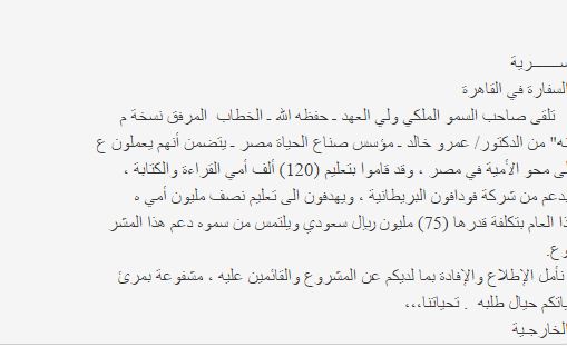 وأوضحت السفارة أن المؤسسة تهدف إلى تعليم نصف مليون أمي هذا العام بتكلفة قدره 75 مليون ريال سعودي، مضيفة أن خالد يطلب الالتماس من خادم الحرمين الشريفين دعم هذا المشروع.