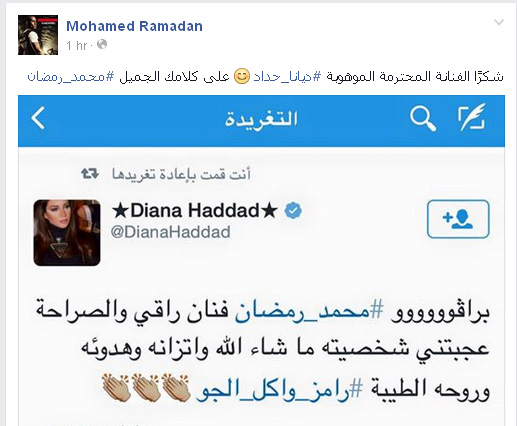 ومن هنا، أصبح محمد رمضان، نجم تويتر ليلة أمس، حيث احتفل به المشاهدون وعبروا عن تقديرهم واحترامهم له، وعلى رأسهم النجمة اللبنانية ديانا حداد التي وجهت تحية احترام وتقدير لرمضان، حيث قالت: "برافوووو محمد رمضان فنان راقي والصراحة عجبتني شخصيته ما شاء الله واتزانه وهدوئه وروحه الطيبة"، ليتوجه لها بعدها رمضان بعبارات الشكر عبر صفحته الرسمية على فيسبوك.