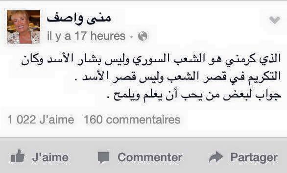 تناقل ناشطون على مواقع التواصل الاجتماعي صور منشورات من صفحة الفنانة السورية الكبيرة منى واصف توجه فيها انتقادات للنظام السوري مما أثار موجة من الغضب بين المتابعين وصلت الى حد شتم الفنانة منى واصف و اعتبار انها لا تستحق التكريم.