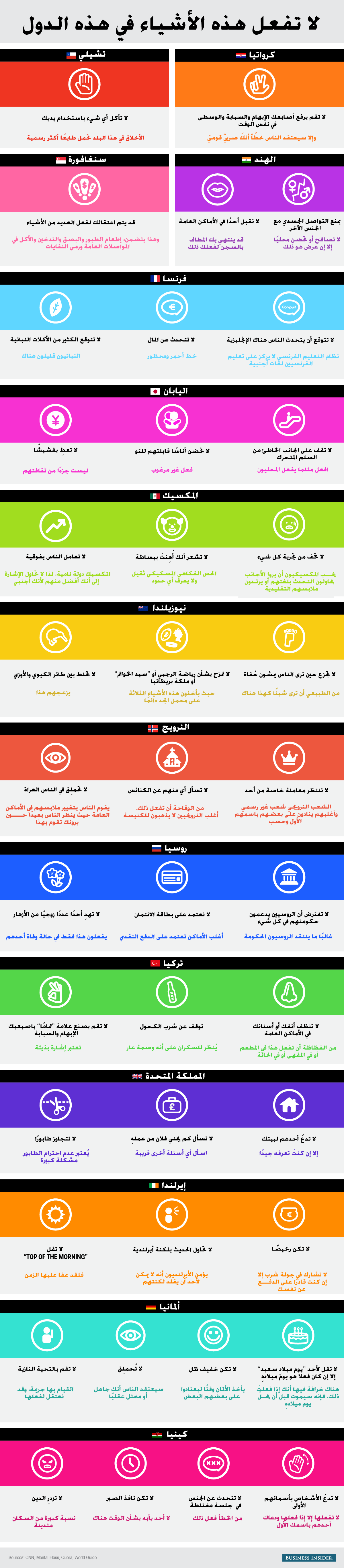 في هذه الصورة نصائح تم تجميعها من عدة مواقع متخصصة، حول بعض الأشياء التي قد يساء فهمها إن فعلتها في دولة غير دولتك الأم. نقدم لك هذه التعليمات كي لا تفعل هذه الأشياء في هذه الدول.
