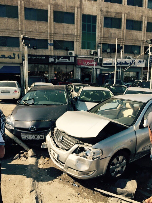 وفي التفاصيل، قال شهود عيان بأن حادث سير مروع وقع في شارع المدينة الرياضية و قبل مدارس اكسفورد بالتحديد مساء يوم أمس الجمعة وقبل وقت الإفطار بساعات قليلة، وأدى هذا الحادث إلى تحطيم ما لايقل عن ١٠ سيارات تابعة لأحد معارض السيارات في المنطقة، حيث أن سائق المركبة المسرع في قيادته فقد السيطرة على المركبة ودخل على المعرض دون قصد، مما أدى إلى إصطدامه بعدد من سيارات المعرض وتحطيم عدد كبير منها