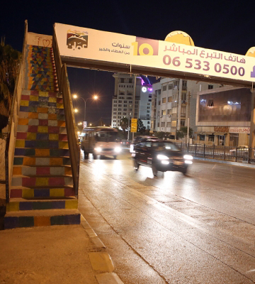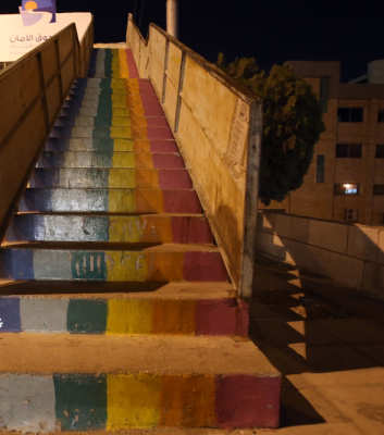 وتظهر صور جسراً للمشاة قرب الدوار الخامس في عمّان مدهون بألوان الطيف التي يتخذها المثليون شعاراً لهم.