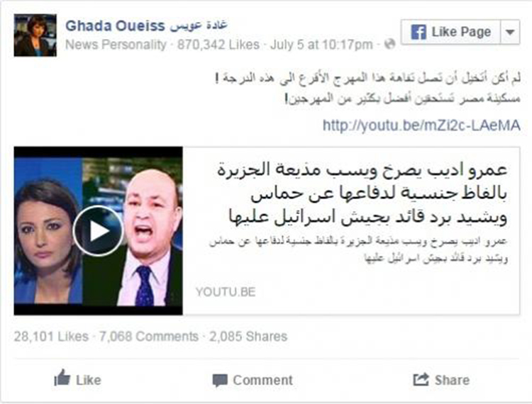 هاجمت المذيعة اللبنانية في قناة الجزيرة القطرية، غادة عويس، الإعلامي المصري، عمرو أديب، بعدما انتقد طريقة تناولها للهجمات الإرهابية الأخيرة، التي شهدتها سيناء.