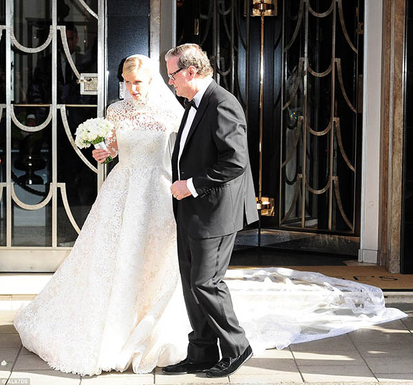 وتابعت الصحيفة أن والدها رافقها أثناء خروجها من الفندق فى مشهد درامي ظهرت فيه علامات تجارية لدار أزياء إيطالية، مشيرة إلى أنها تعرضت لموقف محرج أثناء خروجها من الفندق حيث علق فستانها الطويل فى عجل السيارة التى تقلها الى القصر.