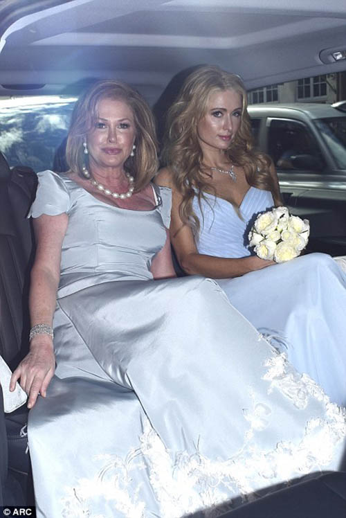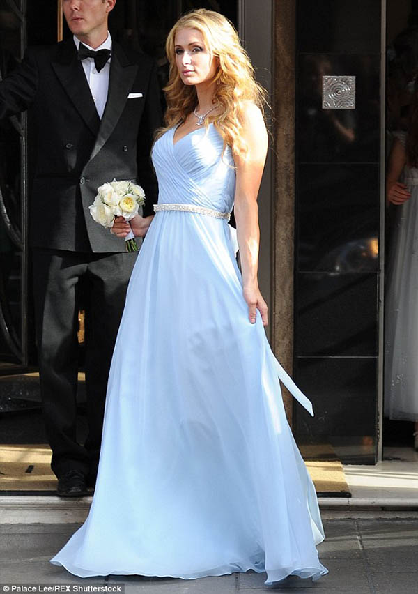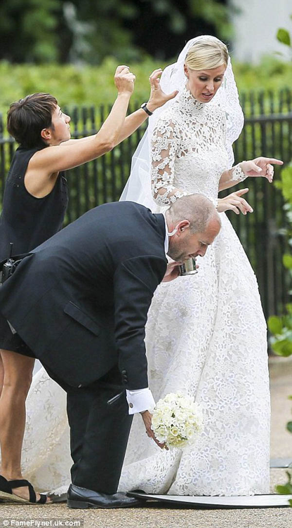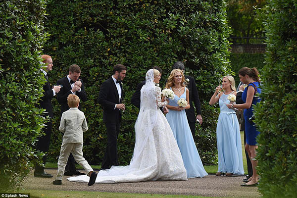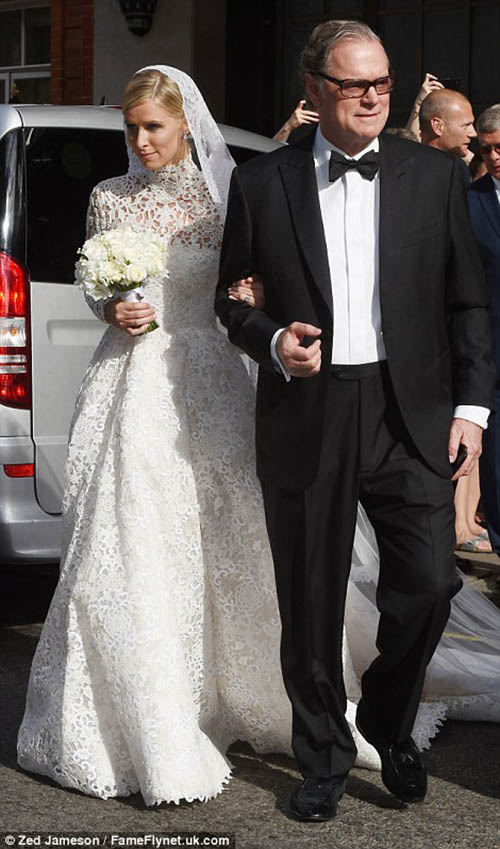 ولفتت الصحيفة البريطانية في تقرير لها، الجمعة، أن نيكي هيلتون كانت ترتدى فستان على شكل قطار طويل مع الحجاب التقليدي وباقة من الورود البيضاء، مشيرة إلى أنها شوهدت أثناء مغادرة فندق كلاريدج متجهة إلى قصر كينجستون في لندن لبداية حفل زفافها على ولى العهد جيمس روتشيلد.