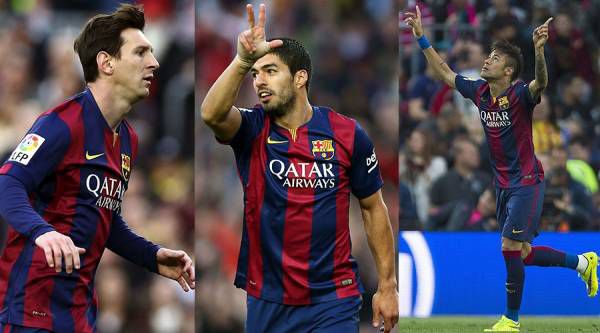 أصبح كل من ميسي ونيمار ولويس سواريز الثلاثي الهجومي الأكثر تهديفاً خلال موسم واحد في تاريخ نادي برشلونة الأسباني بعد أن سجلوا مجتمعين حتى المرحلة الحالية من الموسم 102 هدفاً.وسجل ميسي 49 هدفا ًونيمار 32 هدفاً وسواريز 21 هدفاً ليتخطوا حاجز المئة هدف الذي سجله ثلاثي برشلونة ميسي (38) وايتو (36) وتيري هنري (26) عام 2009.واكتسح برشلونة أمس الثلاثاء منافسه خيتافي بسداسية نظيفة في المرحلة 34 من مسابقة الدوري الأسباني، ظهر خلالها القدرات المتميزة للثلاثي الهجومي، حيث سجل ميسي هدفين، أحدهما من ضربة جزاء، وأحرز سواريز ثنائية أيضاً، فيما سجل نيمار هدفاً واحداً، وأكمل تشافي هيرنانديز السداسية بهدف آخر.وقال لويس أنريكي المدير الفني لبرشلونة عقب المباراة: 'لا أتذكر مباراة أخرى تعج بأهداف غزيرة ورائعة مثل هذه المباراة'.