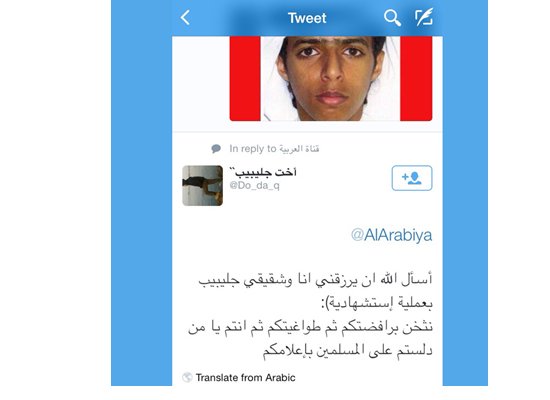 واختتمت القحطاني تهديداتها بتنفيذ عملية انتحارية برفقة شقيقها ضد المواطنين السعوديين الشيعة إلى جانب قناة “العربية” بقولها “أسأل الله أن يرزقني أنا وشقيقي جليبيب بعملية استشهادية نثخن برافضتكم ثم طواغيتكم ثم أنتم يا من دلستم على المسلمين بإعلامكم“.