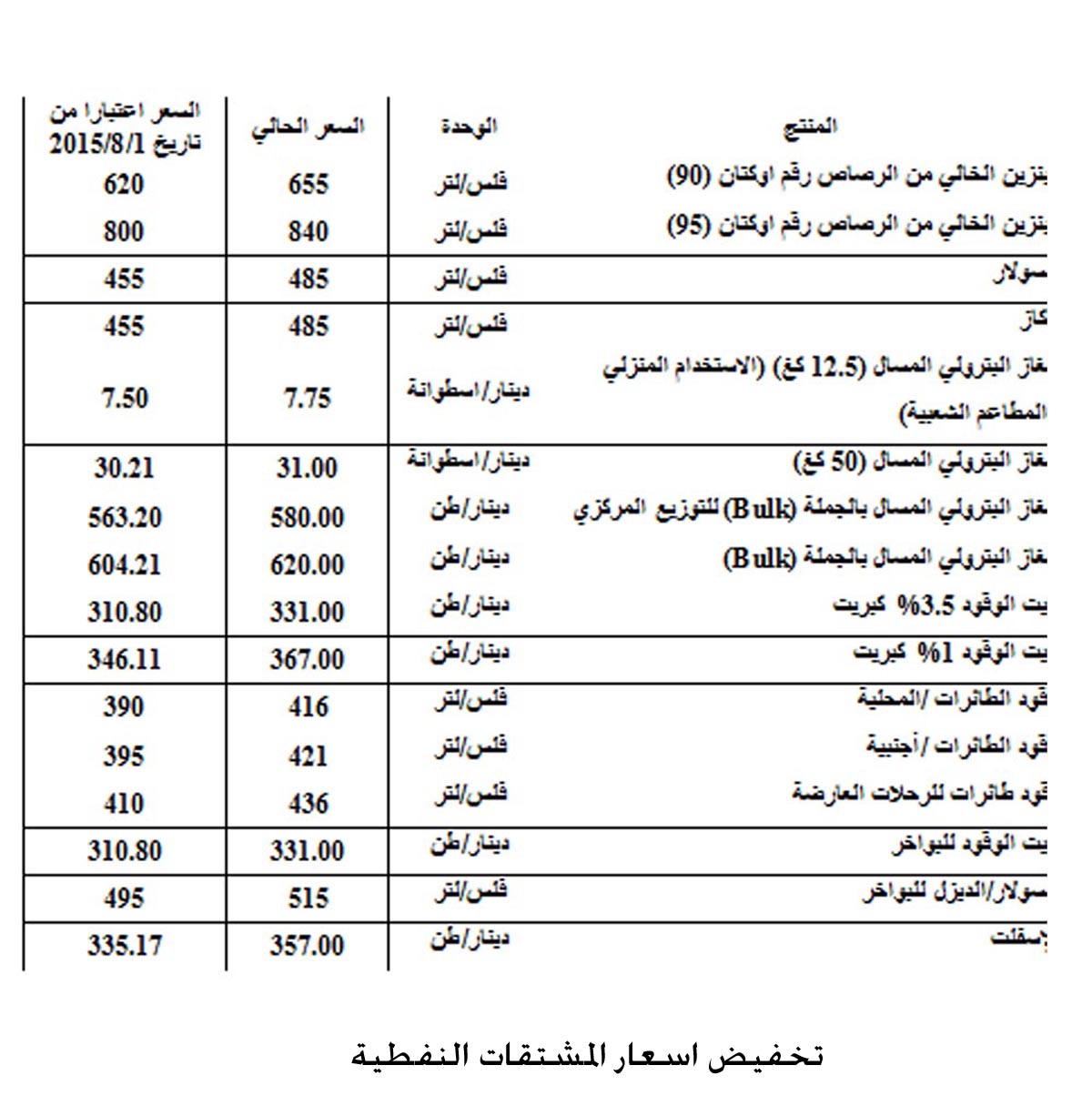 وبموجب القرار تم تخفيض اسعار البنزين الخالي من الرصاص رقم اوكتان (90) من 655 فلسا/ لتر الى 620 فلسا/لتر, والبنزين الخالي من الرصاص رقم اوكتان (95) من 840 فلسا/لتر الى 800 فلس/لتر, والسولار من 485 فلسا/لتر الى455 فلسا/لتر, والكاز من 485 فلسا/لتر الى455 فلسا/لتر, والغاز البترولي المسال (12.5 كغ) (الاستخدام المنزلي والمطاعم الشعبية) من7.75 دينار/اسطوانة الى 7.50 دينار/اسطوانة.