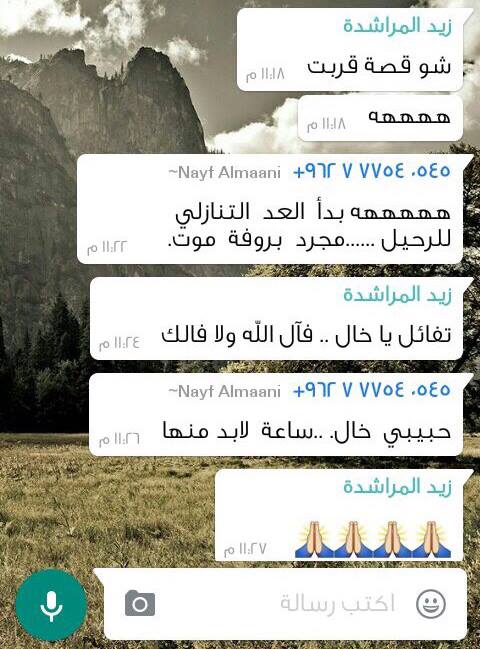 نشر الزميل الإعلامي زيد المراشدة من قناة الحقيقة الدولية صورةً تبين حواراً دار بينه وبين الإعلامي المرحوم بإذن الله تعالى نايف المعاني (أبو شهم) تبين ان المعاني توقع وفاته قبل عدة أيام