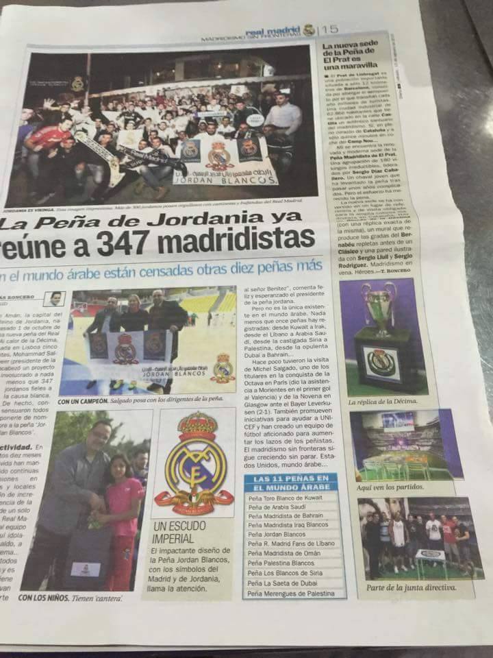 أحمد أبو جعفر - سجلت رابطة جماهير ريال مدريد الرسمية بألاردن انجازا جديدا يحسب للرابطة وللقائمين عليها ، عندما نشرت صحيفة الاس الاسبانية تقريرا مفصلاً حول نشاطات والاعمال التي تقوم بها الرابطة بالاردن ، والتي يرأسها السيد محمد ابو كبير .