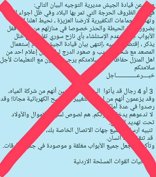 وقد طلبت الصفحة الرسمية لإذاعة الأمن العام من متابعيها عدم تناقل هذه الرسالة لانها تبث من قبل حاقدين من خلال مواقع التواصل الإجتماعي وقالت إذاعة الأمن العام :