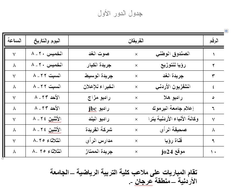 وتشهد حوارات الدور الأول عشر مباريات تجمع: الرأي والفريدة، الصندوق الوطني لدعم الحركة الرياضية والشبابية واذاعة صوت الغد، صحيفة الغد والوسيط، شركة رؤيا للتوزيع وجريدة الكبار الاعلانية، التلفزيون الاردني والخبراء للدعاية والاعلان، اذاعة هلا ومزاج، كلية الاعلام بجامعة اليرموك وراديو jbc، راديو البلد ووكالة الانباء الاردنية بترا، الممتاز وjo24، رؤيا ومدارس الرأي.