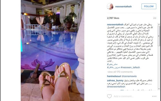 نشرت الفنانة نسرين طافش صورة لقدميها عبر حسابها الخاص على "أنستغرام"، وكتبت تعليقاً أكدت فيه أنها ترغب بتصوير كل ما تراه جميل، وأن رجليها ليستا عورة، داعية المنتقدين إلى الكف عن الفلسفة، حيث كتبت "رجلي مش عورة و شوزاتي أعزكم الله مش عورة لحتى ما صورهون. بحب صور التفاصيل الجميلة براحتي وبكيفي. بدي صور سناني، أذني، إيدي، كاسة أو سائل الجلي، اكسسوار أو رجلي أو شعري أو رمشي أو ستارة أو باب أو صحن أو قطة أو كلب أو شجرة أو شوز أو زهرة أو كتاب أو لوحة أو مكان طبيعي بصور الي بيعجبني".