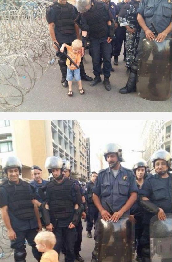تناقل ناشطون على مواقع التواصل الاجتماعي صورا لطفل تقدم بكل ثقة الى الشريط الشائك الموضوع في ساحة رياض الصلح حيث ينتشر العشرات من مكافحة الشغب. وحاول ان يلعب دور الشرطي وطلب من احد العناصر اعطاءه العصا التي تستعتمل لصد المتظاهرين، وعندما فشل انتزعها بالقوة على وقع ابتسامات العناصر الامنية.النهار