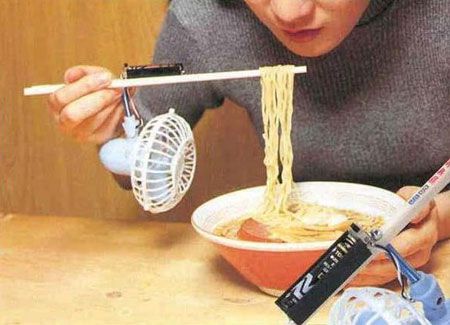 المروحة من إبتكارات اليابان مثبته على عصاة الطعام اليابانية الخشبية و تقون بالنفث في الهواء من أجل تبريد الهواء و تناول الطعام في الوقت نفسه.