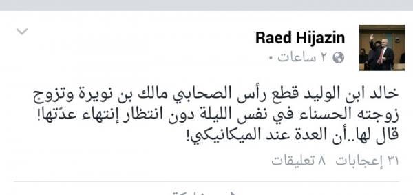 حيث نشر النائب حجازين منشور يقول فيه :" خالد ابن الوليد قطع رأس الصحابي مالك بن نويرة وتزوج زوجته الحسناء في نفس الليلة دون انتظار عدتها! قال لها .. ان العدة عند الميكانيكي !