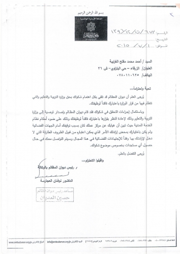 وقرر المعلم أخيراً تقديم شكوى لديوان المظالم بحق الوزارة، الذي أنصف المعلم بإصدار توصية لوزارة التربية يوم 1/7/2015 لإعادة النظر بقرار فصل المعلم من وظيفته، معللاً ذلك أن تغيبه عن عمله كان لأمر طارئ بعد توقيفه أمام الجهات القضائية للتحقيق معه، حيث صدر حكم ببراءته من التهمة الموجه إليه.