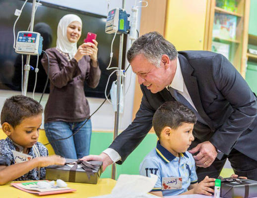 مشهد إنساني رائع عنوانه الأمل والتفاؤل عاشه هؤلاء الأطفال، الذين يرقدون على أسرّة الشفاء في قسمي برنامج زراعة نخاع العظم، وأورام الأطفال داخل المركز، بعد أن بادلهم جلالة الملك التهنئة بالعيد، وقدم لهم أجهزة كمبيوتر لوحية (i-Pad) هدية العيد.