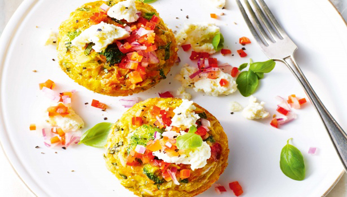 5- أضيفي البروكلي والأرز المطهي والفلفل المشوي والبيض والريحان والملح والفلفل إلى مزيج البصل والبطاطا الحلوة والثوم، ثم قلبي حتى تتجانس المكونات، وبعدها ضعيها في عيون صينية المافن أو الكب كيك، وأدخليها الفرن الساخن لمدة 20 دقيقة أو حتى يصير كيك الأرز ذهبيا ومنتفخا.