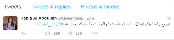 وقالت الملكة في تغريدة لها على " تويتر" :" بنرفع راسنا فيكم ابطال منتخبنا والفوز دايما حليفكم بعون الله "