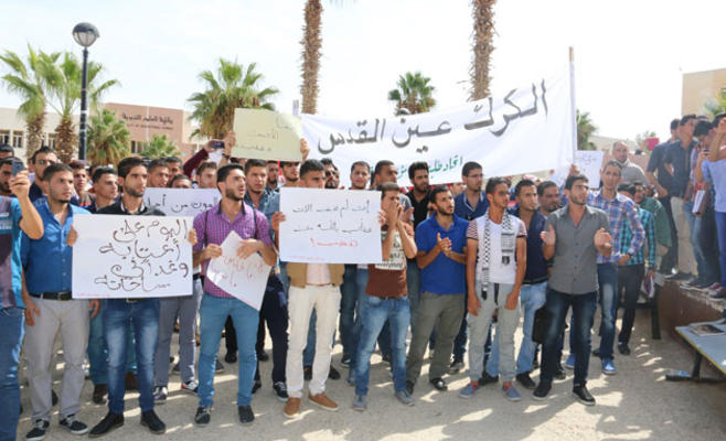 وفي جامعة مؤتة بمحافظة الكرك، نفذت أسرة جامعة وقفة تضامنية مع الأهل المرابطين الفلسسطينيين دفاعا عن المسجد الأقصى.