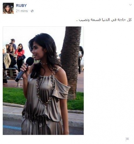 ونشرت روبي في صفحتها الرسمية على موقع "فايسبوك" صورةً لها، معلقّة عليها: "كل حاجة في الدنيا قسمة ونصيب".