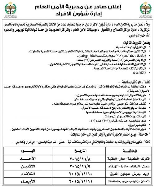 اعلنت مديرية الامن العام / ادارة شؤون الافراد عن حاجتها لتجنيد عدد والتأهيل ٬ موسيقات الامن العام ٬ والمراكز الحدودية من حملة شهادة البكالوريوس من الاناث بالصبغة العسكرية لحساب ادارة السير المركزية ٬ ادارة مراكز الاصلاح والدبلوم الشامل والتوجيهي .
