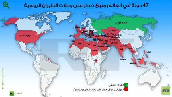 ونقلت وكالة روسيا اليوم تقريراً يتحدث عن 47 دولة تشكل خطراً على رحلات الطيران الروسية.