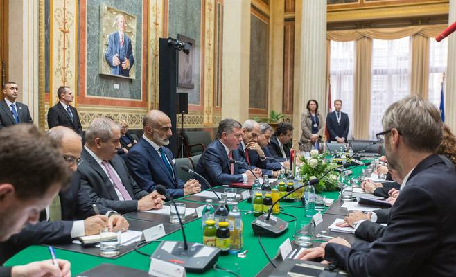 وقال جلالة الملك، خلال جلسة المباحثات الموسعة، «أشعر بمنتهى السعادة أن أزوركم مجددا في فيينا، إن العلاقة التي تجمع بلدينا وشعبينا قديمة وتاريخية، وتعد مثالاً يحتذى في كيفية بناء وترسيخ العلاقات الثنائية عبر الزيارات المتبادلة، ومنها زيارات جلالة المغفور له الملك الحسين في الماضي».