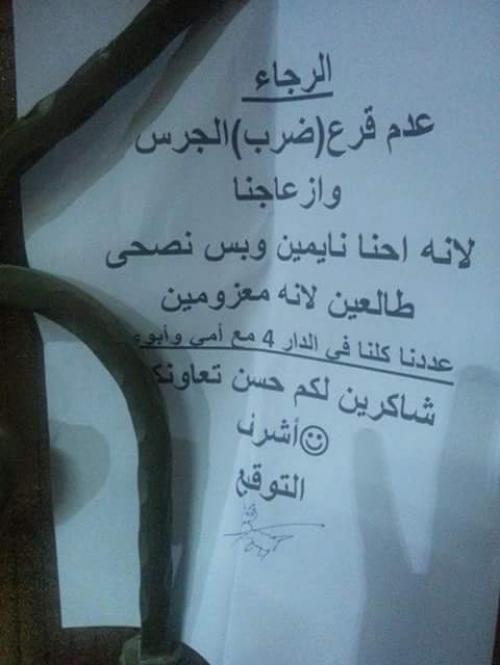 وكتب المواطن على الورقة : ' الرجاء عدم قرع الجرس وإزعاجنا لأنه إحنا نايمين وبس نصحى طالعين لأنه معزومين على الغدا ، عددنا أربعة مع إمي وأبوي ' .
