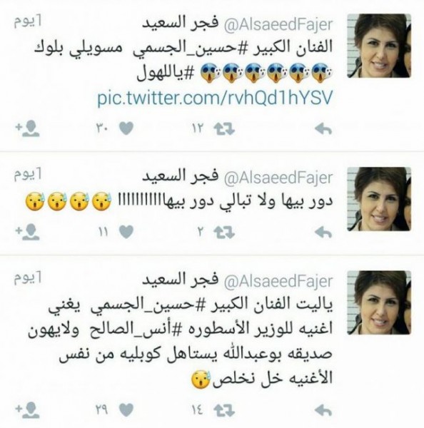 قالت الإعلامية الكويتية "فجر السعيد " أنها تفاجئت بعد أن قام الفنان الإماراتي حسين الجسمي بحذفها وحظرها من قائمة الأصدقاء على حسابه في موقع التواصل الإجتماعي " تويتر" .