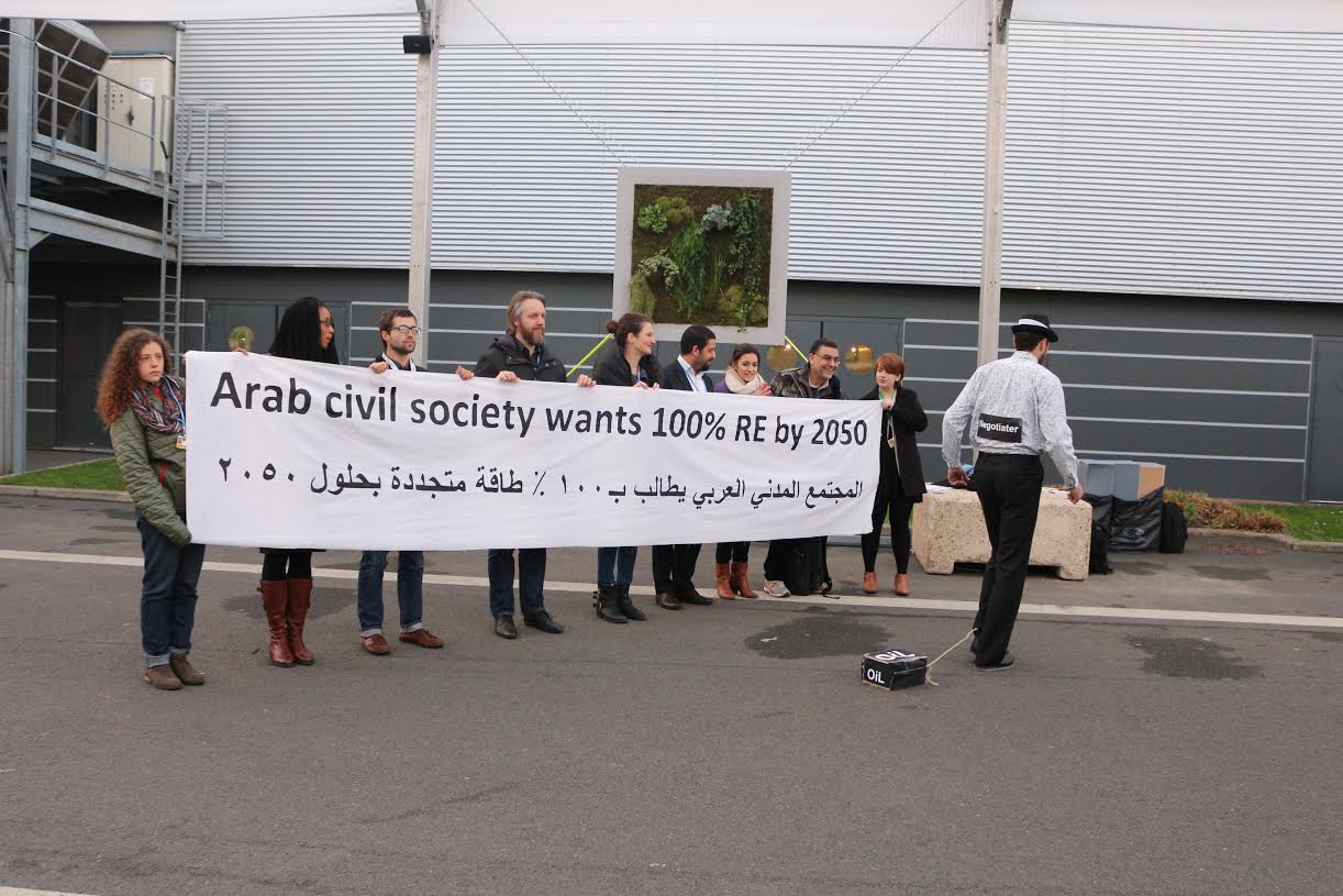 وفي تحرّك قام به ناشطون من إندي-أكت وناشطون شباب آخرون، جرى تمثيل مشاهد تم فيها جرّ المفاوضين من جانب قطاع صناعة النفط، الأمر الذي منعهم من التحرّك باتجاه اتفاق طموح. وحمل الناشطون لافتة مكتوب عليها: "المجتمع المدني العربي يدعو الدول العربية إلى الانتقال إلى استخدام الطاقة المتجدّدة بنسبة 100%".